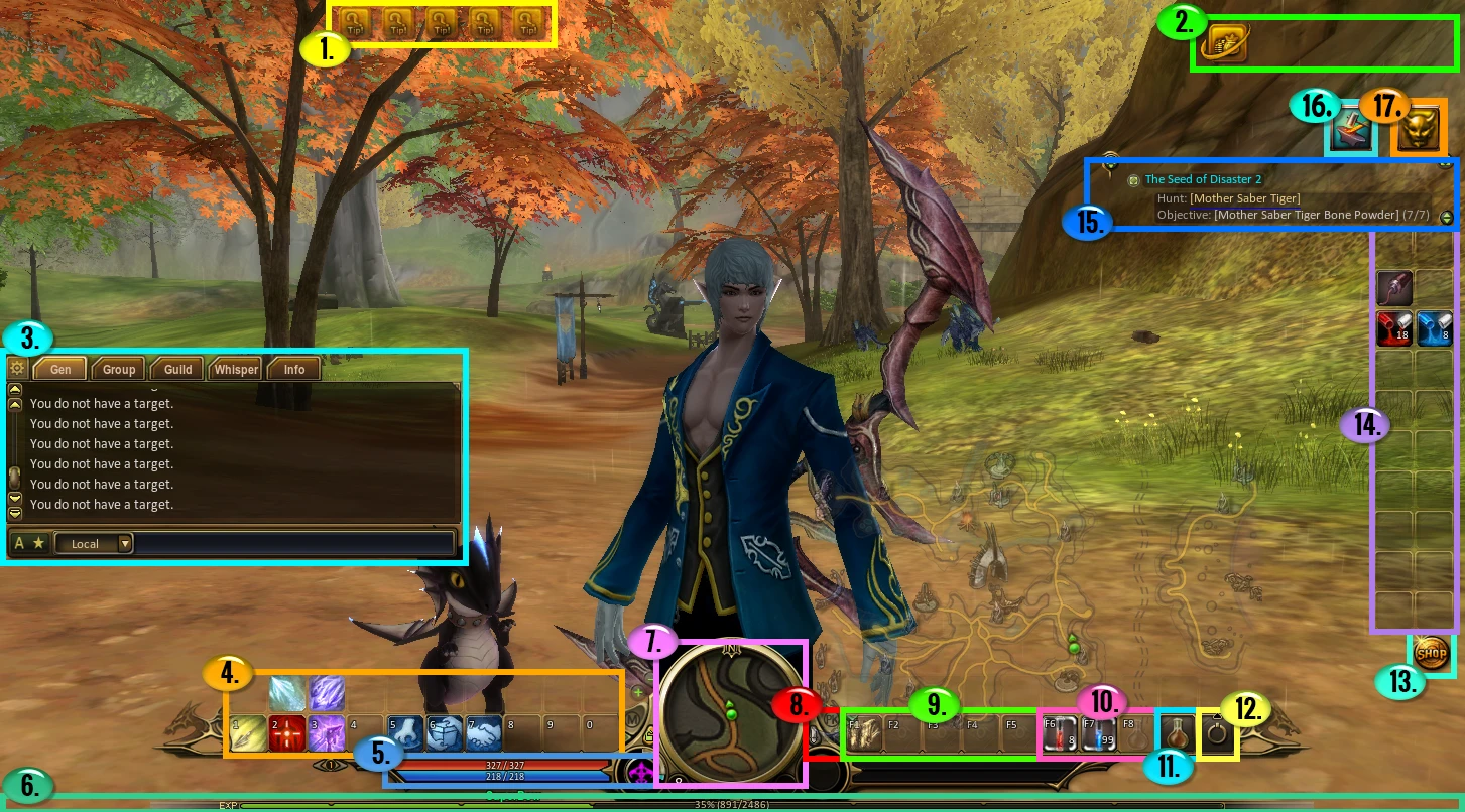 | 15. Ongoing Quests | A list of accepted and ongoing quests. You can turn on auto-traveling by clicking on a quest target. |